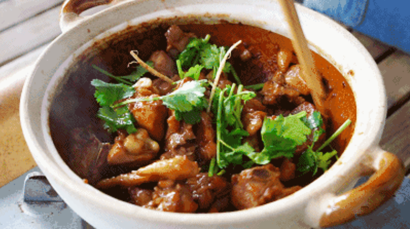 四、把腌好的鸡肉放进砂锅,放少许老抽,少许酒,翻拌均匀,盖上盖子,用大火煲20分钟,加入少量糖,放进一些香菜就可以出锅了!