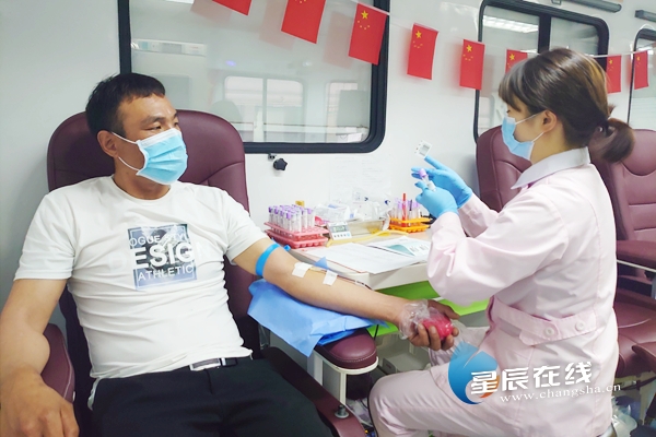 下午一点时,长沙下起了雷阵雨,一位年轻人走进了献血车。我今天出门遛弯呢,看到献血车就来了。 李永坡是河南安阳人,来长沙工作6年了。他说:我每年都会献一次血,一般都是心血来潮,看到有献血车就上。他说,今天来献血才知道,疫情期间上街的人少了,献血的人也就少了,长沙正用血紧张着。我回去后也和身边的朋友说说,呼吁一下,让他们能来的都来。