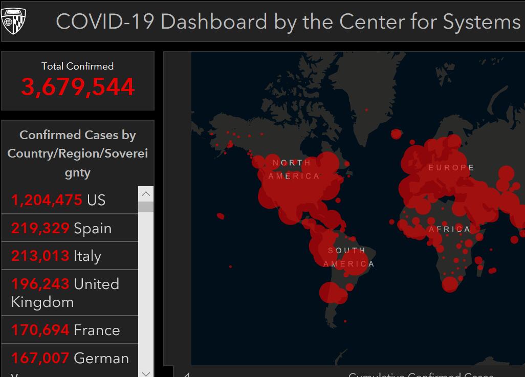 据美国约翰斯·霍普金斯大学数据实时数据显示,截至北京时间5月6日17时45分左右,全球累计确诊超过367万例,总计3679544例。共有40个国家确诊人数超过1万例,其中美国确诊人数最多,为1204475例。