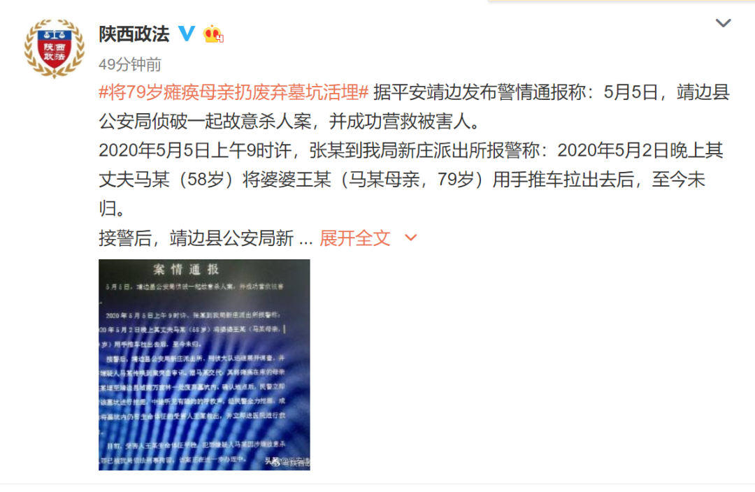 中国有句老话叫做,养儿防老。为人子女,不孝在中国是会被人戳脊梁骨的,虐待父母更是天理不容的事情,活埋母亲更是禽兽之举。昨天(5月6日)网上传出了一则令人气愤的消息,陕西省榆林市靖边县一名男子竟将79岁瘫痪老母亲活活埋进废弃墓坑,幸运的是,老人的儿媳妇发现情况不对后报警,警方出警及时,将老人被救出后,已送至医院进行救治,并无生命危险。