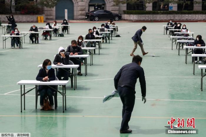 当地时间4月25日,韩国为了避免新型冠状病毒传播,在露天操场为求职者举行入职考试。图为监考人员在地上捡起被风吹掉的文件。