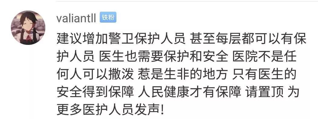 也有一些网友建议,应该在医院增加警卫保护人员保障医护人员安全,只有医生的安全有保障,病人的健康才有保障。