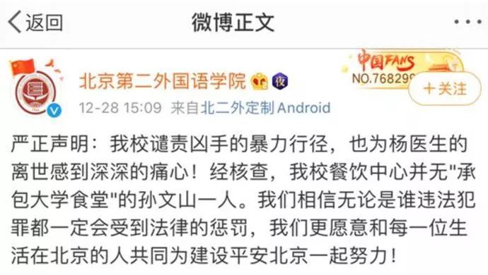 而对于网传的“犯罪嫌疑人孙文斌的大哥叫孙文山,承包‘北二外’的大学食堂,是黑社会狠角色”一说,北京第二外国语学院28日下午通过官方微博发布声明称,该校餐饮中心并无“承包大学食堂”的孙文山一人。