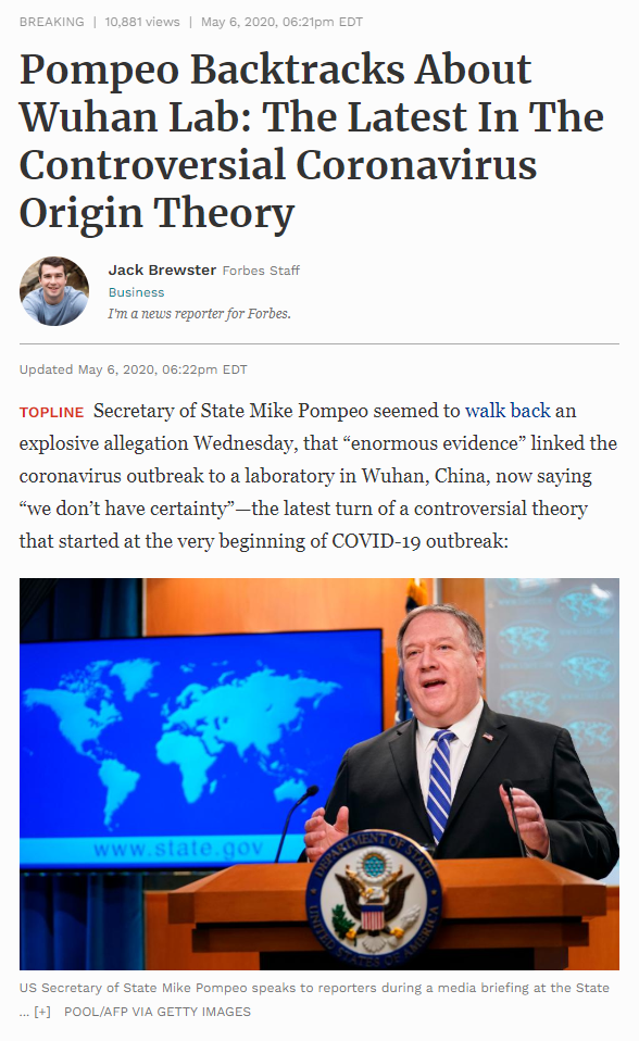 △福布斯网站报道,最新转折,蓬佩奥说“我们不确定”病毒来源于武汉实验室。 点击进入专题: 聚焦新型冠状病毒肺炎疫情 全球多国爆发新冠肺炎疫情