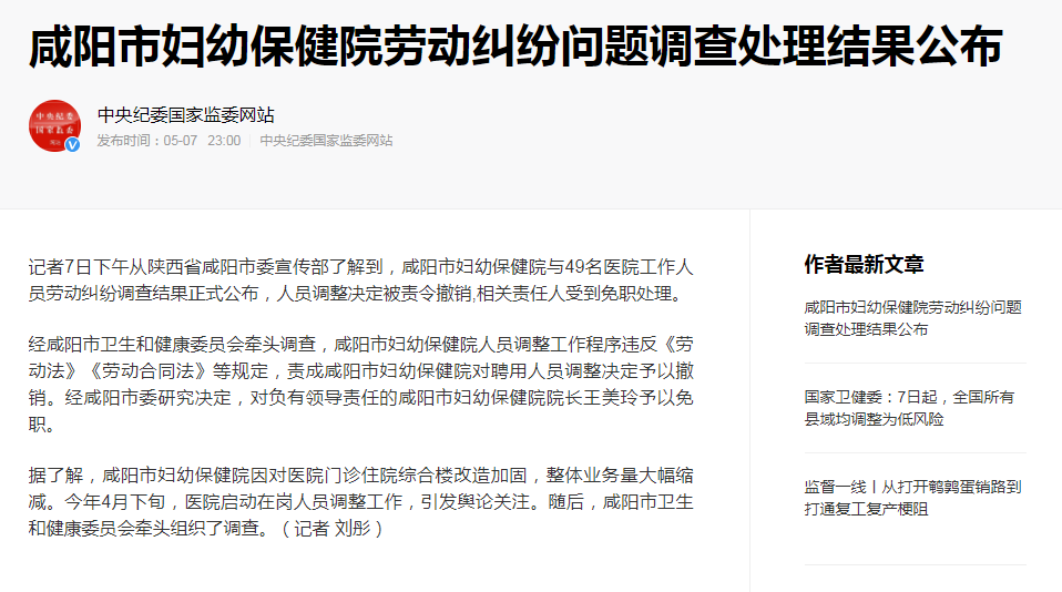 很幸运,在这个时候,咸阳市卫生和健康委员会牵头调查市妇幼保健院聘用人员劳动纠纷一事有果。经查,市妇幼保健院人员调整工作程序违反《劳动法》《劳动合同法》规定。咸阳市责成市妇幼保健院对聘用人员调整决定予以撤销,对负有领导责任的市妇幼保健院院长王美玲予以免职。
