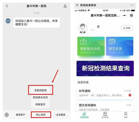 五、检测结果查询1.关注本院微信公众号(嘉兴市第一医院)-栏目“网上医院”―互联网医院-新冠检测结果查询。2.自助机查询打印检验报告(凭身份证)。3.团体检测纸质报告邮寄给单位联系人。