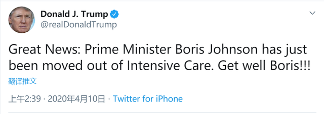 当地时间9日,鲍里斯病情逐渐稳定,离开ICU转回病房监护。特朗普发推表示,好消息:英国首相鲍里斯约翰逊刚刚离开了重症监护室。祝鲍里斯早日康复!!!