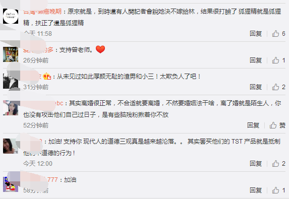 对此,网友留言:从未见过如此厚颜无耻的渣男和小三,太欺负人了吧!其实离婚很正常,不合适就要离婚,不然要婚姻法干啥,离了婚就是陌生人,你也没有攻击他们自己过日子,是有些脑残粉揪着你不放!加油,支持你,现代人的道德三观真是越来越沦落。