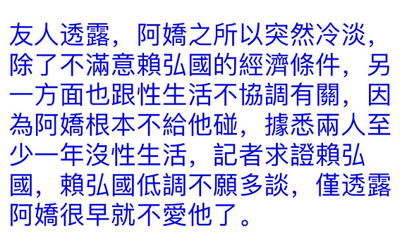 台湾媒体报道,阿娇之所以突然冷淡,除了不满意赖弘国的经济条件,另一方面也跟X生活不协调有关,因为阿娇根本不给他碰,据悉两人至少一年没有X生活。