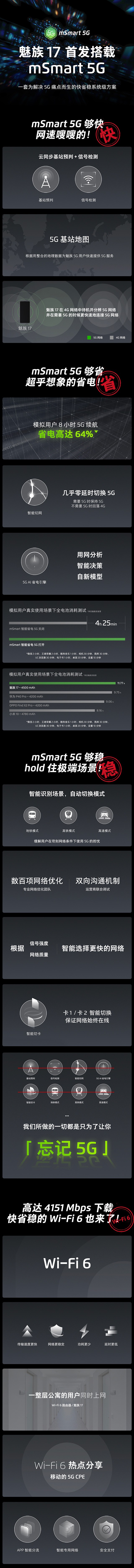 魅族17可以通过云服务将智能终端采集到的5G位置信息同步 服务器并建立5G基站地图, 论我们身处任何地 ,魅族17都能根据服务器的5G基站地图智能切换5G 络,使手机 直保持流畅快速的上 体验。