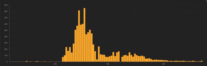 (韩国每日新增病例走势 来源:约翰霍普金斯大学)