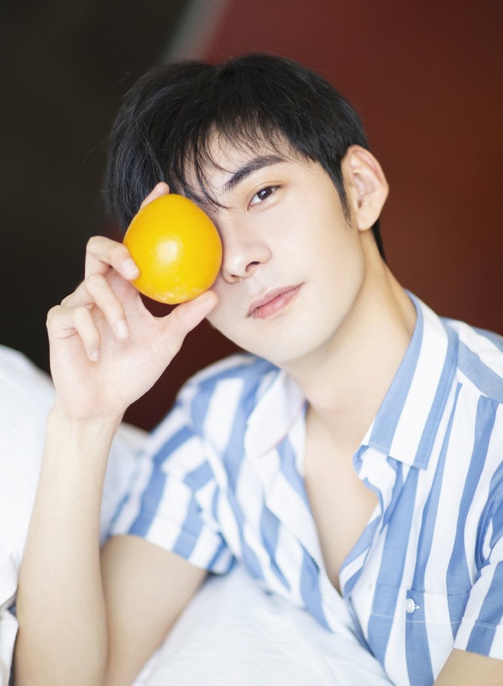 还是这种韩式发型适合他,太有少年感了。蓝色的条纹衬衫时尚感十足,而且非常清爽。而且手中拿着橙子,亮眼的颜色搭配充满了青春活力,是非常减龄的搭配。