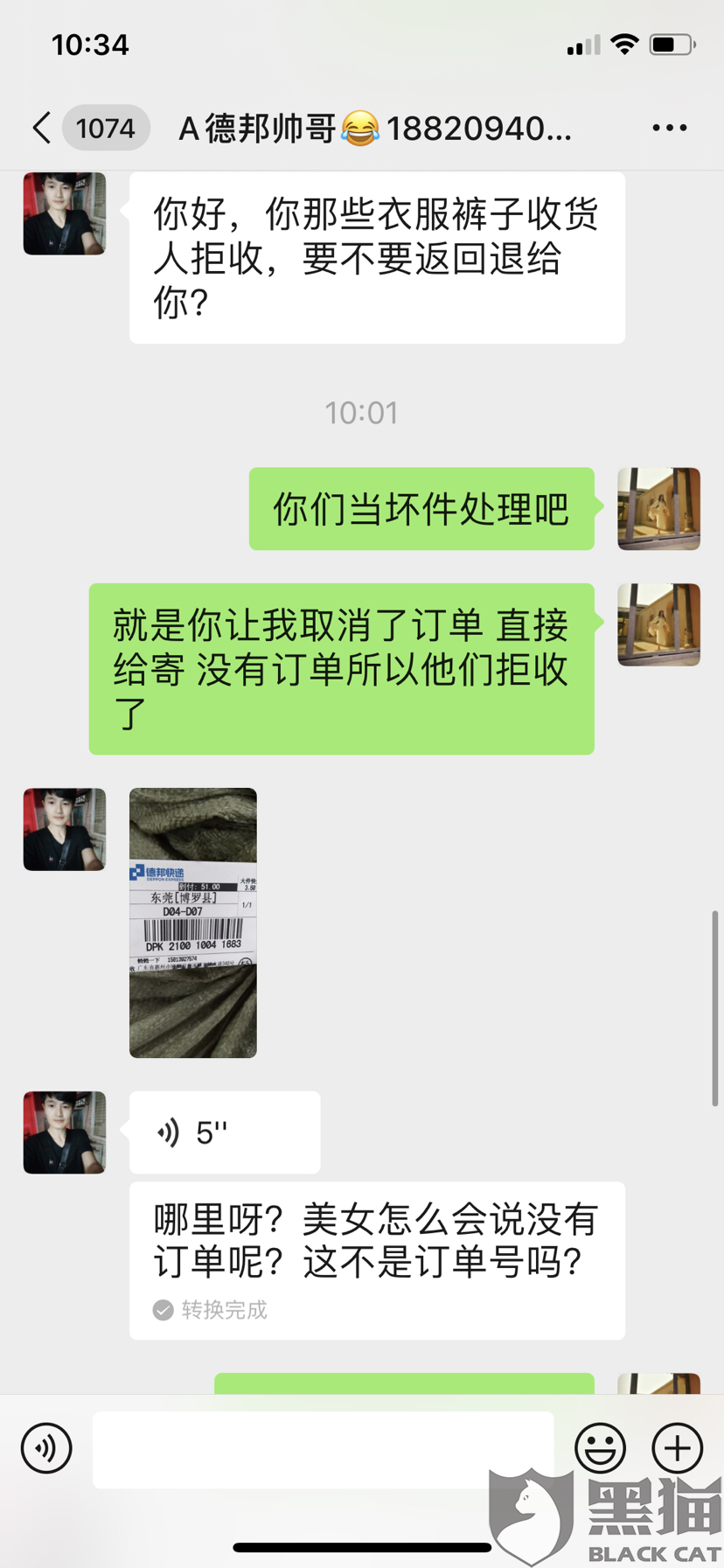 消费者“用户7418626519”在5月6日向黑猫投诉平台反映:“支付宝预约下单回收衣物 德邦上门收件 第一次下单因没有接电话 订单被取消 再次预约 联系快递下午收件 最后订单出问题 德邦让再次下单 但是下单只能是预约单 德邦让取消 直接发收获地址给他 结果导致这个件对方拒收 因为没有订单 而不是德邦快递单 导致德邦一直联系我处理这个件 我让退回 必须我支付来回运费102 我好心邮寄衣物 导致我还要付费 弄的五一假期心情极度不爽”