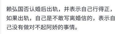 媒体就此事向赖弘国求证,赖弘国否认出轨,表示自己行得正,没有做过任何对不起阿娇的事情。