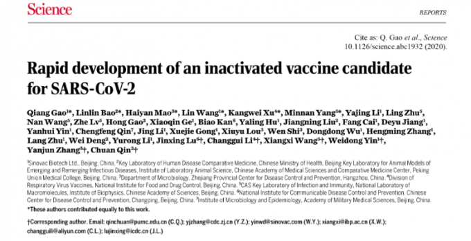 全球知名学术期刊《科学》杂志日前在其官方网站发布了由中国医学科学院医学实验动物研究所秦川团队领衔,联合浙江省疾控中心张严峻团队、科兴控股生物技术有限公司等多家单位合作完成的研究文章《SARS-CoV-2病毒灭活疫苗的快速开发》。