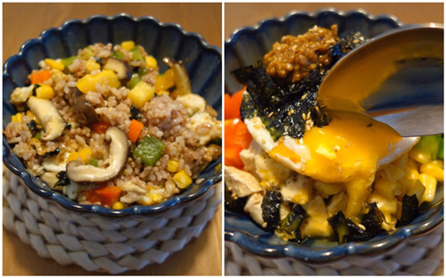 第二道:鸡柳烤蔬食半熟蛋拌饭/清单食材/糙米(或藜麦、五谷杂粮等等适个人口味)80g、玉米粒40g、香菇3朵、彩椒红绿黄各1/6颗(总份量相当于半颗彩椒)、烤好的鸡胸肉50g、鸡蛋一颗、蒸鱼豉油、黄豆酱少许、橄榄油少许、白芝麻、海苔