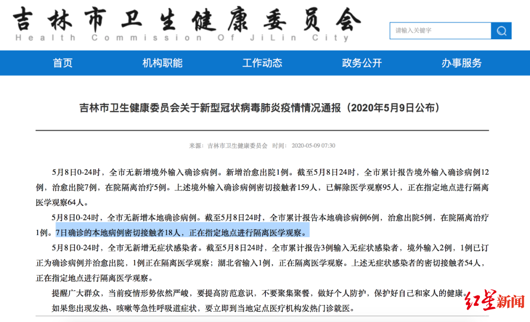 另据吉林市卫健委9日通报,5月8日0-24时,全市无新增本地确诊病例。截至5月8日24时,全市累计报告本地确诊病例6例,治愈出院5例,在院隔离治疗1例。7日确诊的本地病例密切接触者18人,正在指定地点进行隔离医学观察。