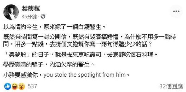 他写道“以为情约今生,原来嫁了一个白痴医生。既然有时间写一封公开文章,既然有钱豪搞婚礼,为什么不多一点时间,用多一点钱,去请个文胆帮你写一两句得体少少的话……”最后他更以一种抖出内幕的口吻评论罗志祥“小猪要感激你,you stole the spotlight from him(你抢了他的风头)”不知对此,你怎么看呢?