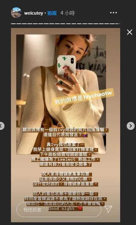 而Ivy本人也透过ins限时动态发文,“听说微博有一个假Ivy有人用我的照片在招摇撞骗,还擅自代替我发言?真Ivy我也是累了…”她澄清,自己一整天买菜、健身,生活过得很充实,驳斥冒牌帐号,“别人的喜怒哀乐不需要你掺一脚,特别是冒牌货,请不要蹭热度刷存在感。”