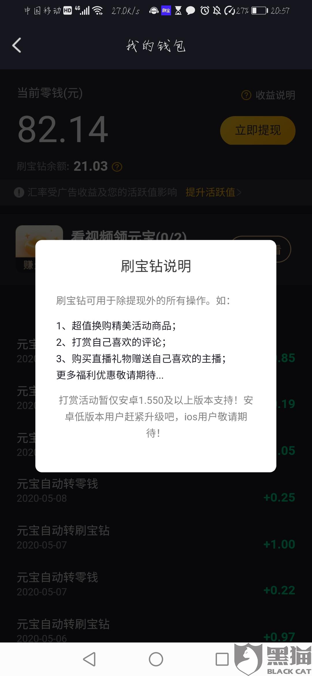 消费者“用户7453740384”在5月9日向黑猫投诉平台反映:“每天刷三个小时的视频,好不容易到一百了,要提现的时候发现一百余额,二十多都是刷钻,刷钻是不能提现的,一天刷的金币,大部分都转为刷钻,根本不能提现”