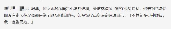 面对网红"V告小妹"称他"爱炮也爱劈"的言论,称过去面对花边绯闻隐而不发是为了顾及阿娇的明星形象,现在要拿起法律的武器维护自己,"我的律师在收集资料,下礼拜一就会提告。不管花多少律师费,我一定告死她。"
