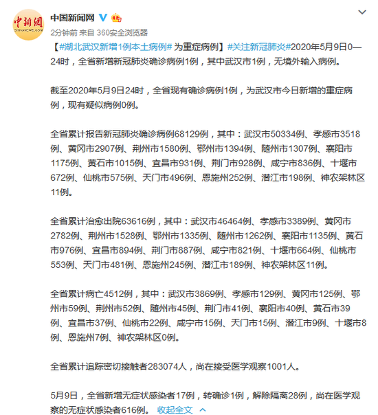 截至2020年5月9日24时,全省现有确诊病例1例,为武汉市今日新增的重症病例,现有疑似病例0例。