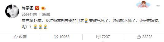 5月9日下午,陈学冬发出动态表示:看完第13集,我准备弃剧《夫妻的世界》。要被气死了,致郁就不说了,说好的复仇呢?