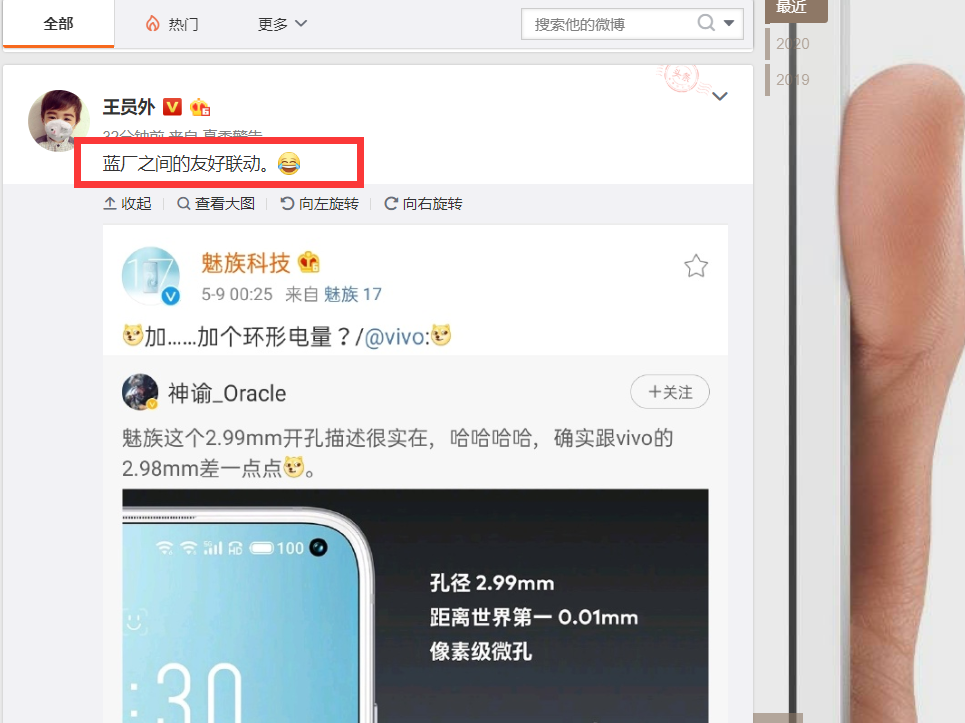 这个对比对象是谁呢?它就是vivo X30,这款手机的正面打孔就是卖点之一,凭借着2.98mm的超小打孔,该机的颜值备受消费者青睐。而魅族高管这边在宣传的时候呢,十分实诚的告诉大众我们的魅族17正面打孔只比世界第一小0.01mm,而不像某些友商那样搞什么“吊打”、“碾压”之类的词汇。有趣的是,魅族的商标和vivo的商标都是以蓝色为主色调,所以很多网友把它们称之为蓝厂,这才出现那位网友称这是“蓝厂之间的友好联动”。