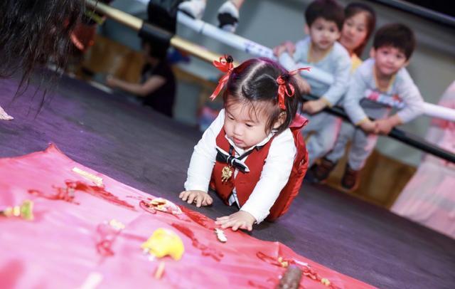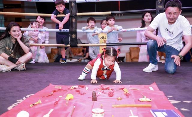 一周岁生日派对上,自然少不了给孩子抓周的环节,话说满地的东西怎么都没有拳击手套呢?也不知道羲羲最后抓了什么。冉莹颖盘着腿在身后,笑得一脸慈爱。