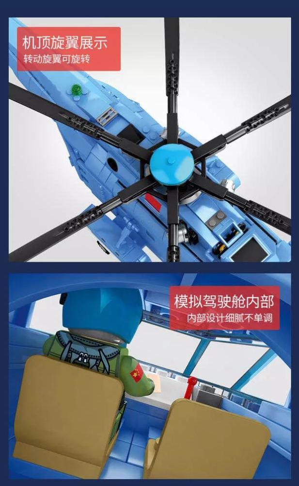 这款直18拼装模型仿真度高,严格按照真机特性,进行细节还原:机头雷达、悬臂式挂架,而且主旋翼和尾梁都可以折叠。整个模型长52厘米,宽36厘米,高17厘米,整机颗粒有908个积木,采用ABS原材料,硬度很高,韧性也好,还有机组公仔赠送,各种场景自由搭配玩法多样。