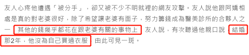 这段婚姻里,赖弘国对阿娇是真心的,花了很多钱在老婆身上,想要哄她开心,友人还爆料这两年时间里,赖弘国都没为自己买过衣服。