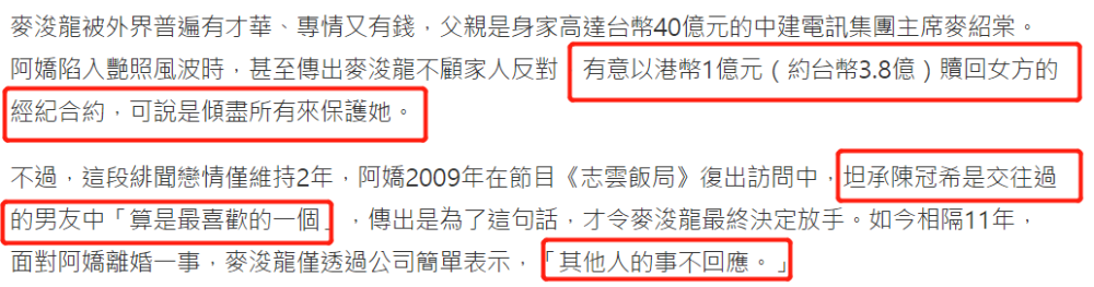 阿娇这边倒没传出什么更多的消息,除了通过英皇表示这是两个人之间的事情,不会再多做回应之后,基本就没其他的爆料了,不过阿娇离婚一事,前任麦浚龙却也被记者追问,但麦浚龙通过公司表示:“其他人的事不回应”。