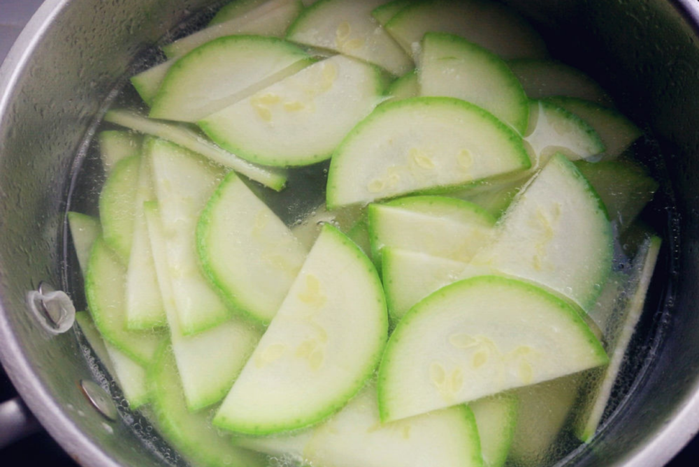 烹饪第五步:锅中加入4碗清水,等待清水煮沸以后,加上西葫芦煮一煮,等待西葫芦煮烂。
