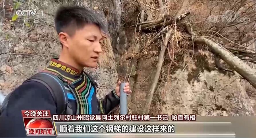 四川凉山阿土列尔村驻村第一书记 帕查有格:现在你看这个线是一个光缆线。这些线路的铺设就是顺着我们这个钢梯的建设这样来的。随着路修通了以后,电、网络等等一系列也实现全通了。