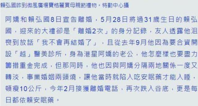 据台媒报道,赖弘国本月底将迎来31岁生日,然而自己已经有两次离婚记录,因此他对友人透露"不会再结婚了"。和阿娇结婚之初正值赖弘国新诊所开业,事业婚姻难以兼顾。在2月接到离婚电话后,赖弘国心情再次颓丧,每天都需要吃安眠药才能入眠。