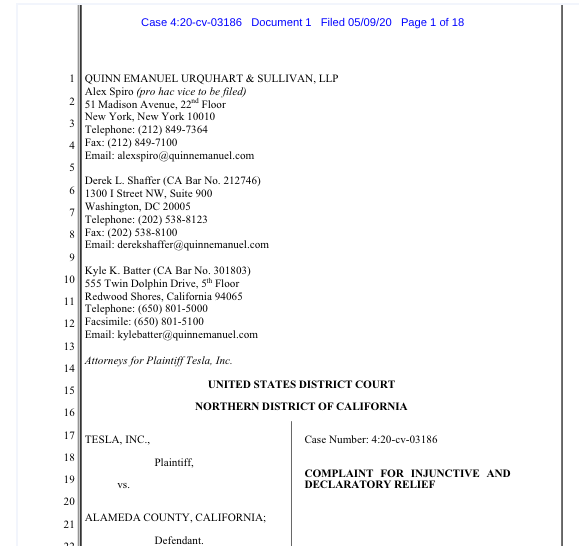 在马斯克发推文的几小时后,特斯拉正式在加州北区地方法院提交诉讼,请求法院针对阿拉米达县的“就地避难令”发布永久禁止令,请求法院判定阿拉米达县的“就地避难令”违反了宪法第十四修正案,违背了加州州长加文・纽森(Gavin Newsom)的指令。