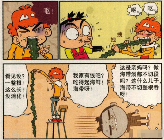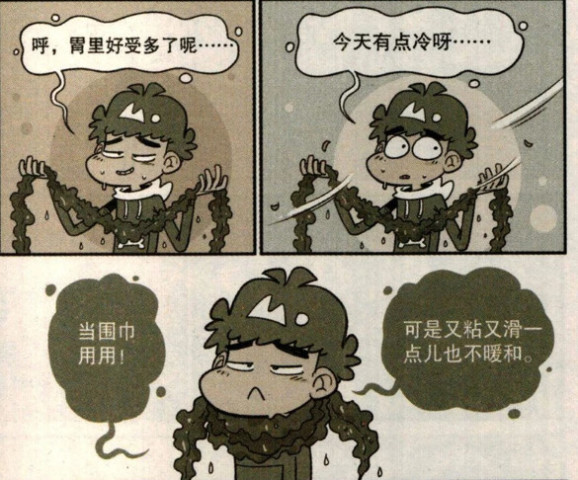 阿衰叹了口气,胃里终于好受多了,以后再也不吃海带这玩意了,都怪老妈海带也不切断煮,早知道就不给她面子吃这么多了,诶呀今天天气好像有点儿冷,用这个当围巾正好呢,可是又粘又滑一点儿也不暖和