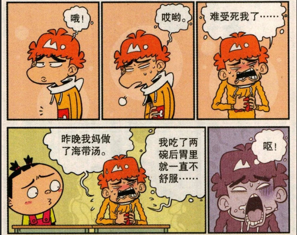 一天阿衰挺着个难受的肚子来到了教室里面,昨天晚上我妈做了海带汤,我吃了两碗胃里就一直不舒服,大脸妹皱起了眉头,看着他这样子的确很难受诶到底是吃坏了肚子还是感冒了,突然此时,阿衰呕吐一声