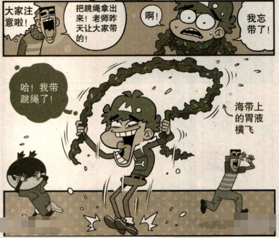 突然这个时候,体育课的大家注意了,把跳绳拿出来,老师昨天让你们带的,体育老师来到了教室检查起了跳绳,阿衰这才意识到自己忘记带了,对了用海带当跳绳,就这样呆头在课上一边跳海带上的胃液横飞