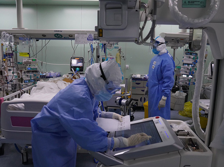 武汉协和西院ICU病房,医生正在准备为患者拍CT胸片。(南方周末记者 翁洹/图)