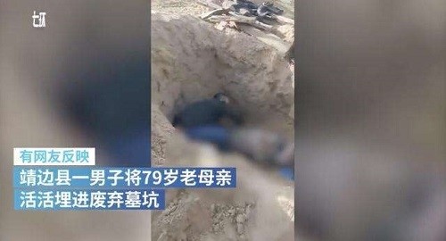 5月2日,陕西靖边一男子马某用手推车,将其79岁母亲活埋在离家3公里处的一出废弃墓穴中,凌晨2点多马某独自回到家中,谎称已将老人送至靖边县新车站,并雇车将其送到甘肃庆城县的亲戚家。5日,由于发现母亲失联,马某妻子选择报警。警方以涉嫌故意杀人罪控制了马某,并在老人被埋三日后将其救出,老人在暗无天日的墓穴被埋三天三夜不吃不喝,静等死亡的到来。在警方公布的视频中,老人被埋的地方用破碎墓碑堵住,掩埋的土并没有踩实在,墓穴里还有一定的空间,老人在经过治疗后无生命危险。等待马某的将是法律的严惩。