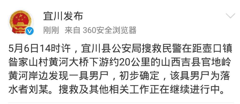 6日下午,宜川县委宣传部发布通报称,今日下午14时许,宜川县公安局搜救民警在距壶口镇昝家山村黄河大桥下游约20公里的山西吉县官地岭黄河岸边发现一具男尸,初步确定,该具男尸为落水者刘某。