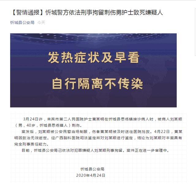 4 月 25 日凌晨,广西忻城县公安局发布通报,经鉴定,嫌疑人刘某顺对本案具有完全刑事责任能力。目前,其已被警方刑事拘留。