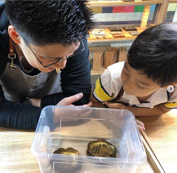 从图中可以看出,霍启刚带着6岁的霍中曦去了一间本地手工艺坊,只见画面中的父子二人都穿着围裙,趴在桌子上一同欣赏着自己做出来的成品,霍启刚脸上带着幸福的笑容,似乎对这份作品很是满意。