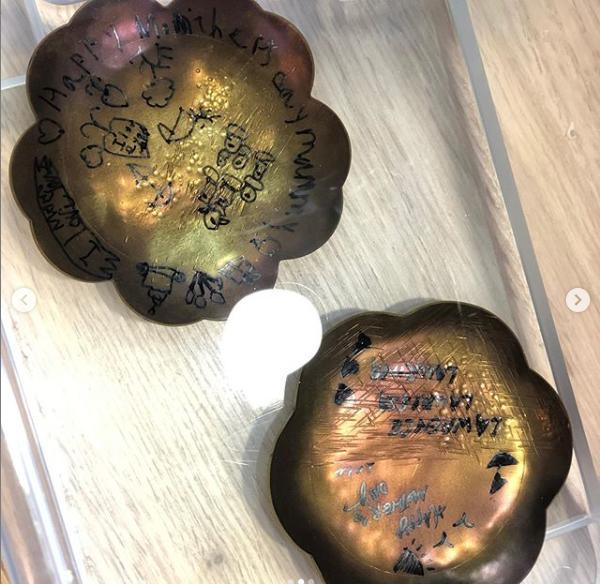 霍启刚还晒出了他们在铜碟上所写的内容,左边那块是霍中曦的作品,上面画着很多童趣的图案,外面一圈用英文写着“妈妈母亲节快乐”以及“我爱妈妈”。霍启刚那块则比较简单,他同样用英文写了“母亲节快乐”,上面还有三个孩子的英文名:长子Lawrence、大女儿Laurissa以及小女儿Laurina。
