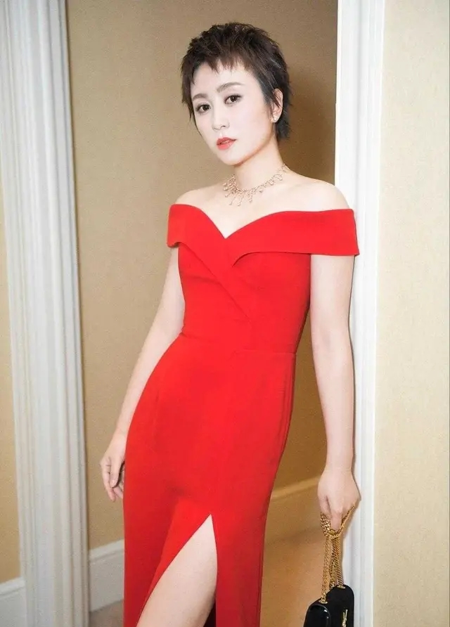 红色的连衣裙短发女生也可以穿搭,马丽穿这款红色的连衣裙在领口的部分采用一字肩的设计,一字肩的版型呈现出来的精致的女人味非常好,将性感的锁骨和香肩呈现出来,修身的版型在勾勒身材曲线的效果上非常好,在裙摆的位置运用高开叉的设计,将腿部线条呈现的淋漓尽致。