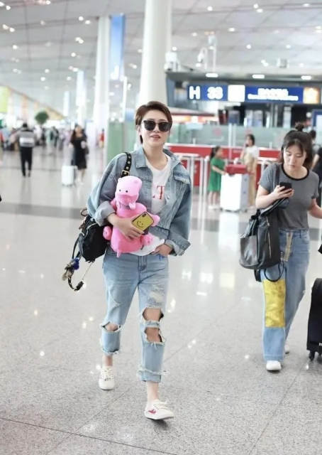 在私服穿搭中马丽的搭配就更加休闲化了一些,牛仔外套搭配破洞牛仔裤呈现出满满的朝气感,在牛仔外套里面搭配一款简单的白色T恤,舒适感十足又起到很好的内搭效果,宽松版型的破洞牛仔裤时尚又清爽,手上抱着的粉色公仔暴露了一颗成熟女性的少女感。