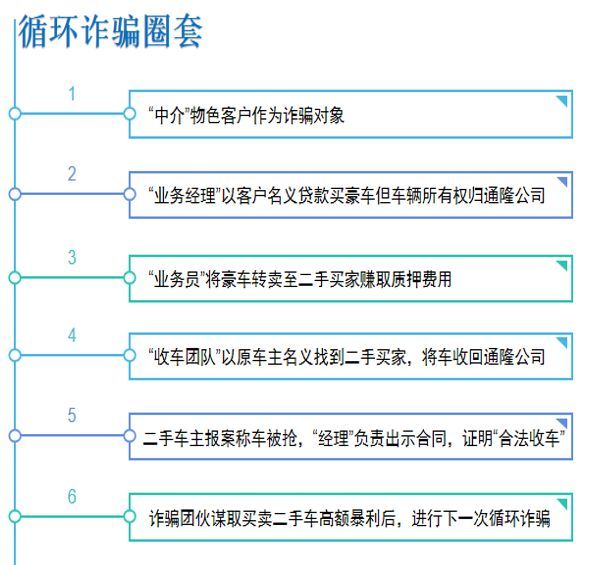 有物色贷款客户的“中介”,负责在社会上物色一些急于贷款的人作为诈骗对象;有负责与客户对接的“业务经理”,利用客户的名义通过通隆公司的担保在银行贷款买豪车,但车辆使用权归通隆公司所有;