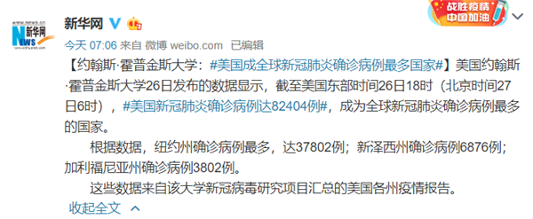 今日,国内媒体援引美国约翰斯霍普金斯大学26日的数据称,截至北京时间今早6时,美国新冠肺炎确诊病例达82404例,成为全球确诊人数最多的国家。