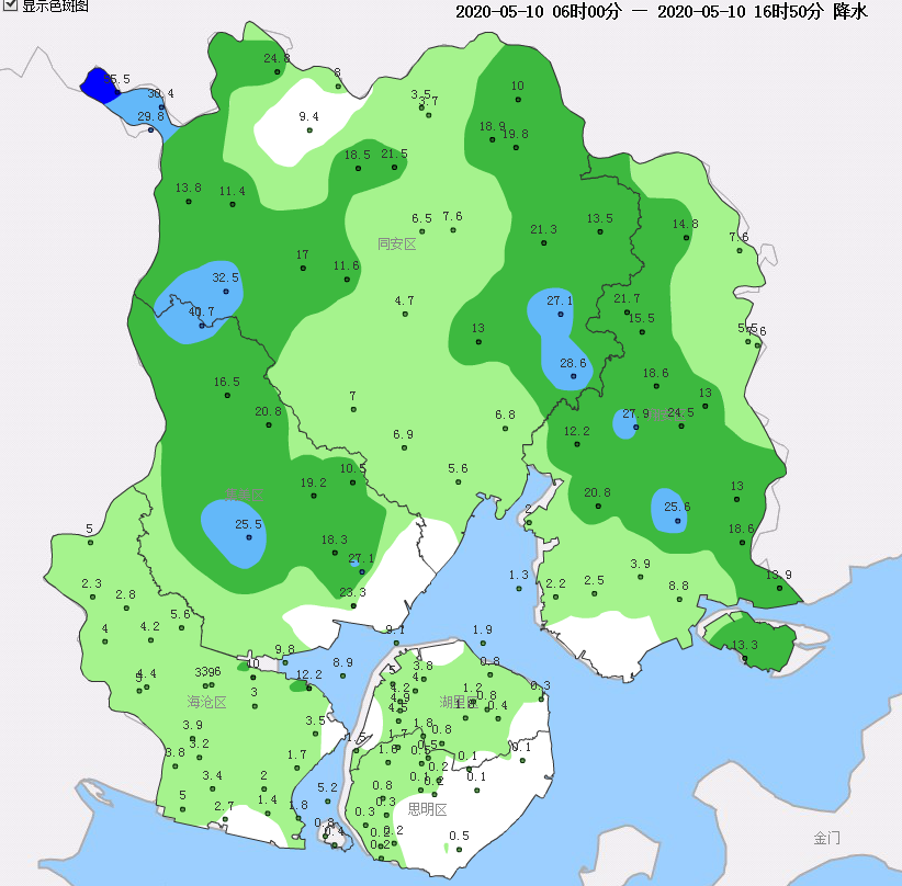 截止到目前为止,岛内西北部普遍下到了小雨的量级。在同安的北部山区,达到了大雨到暴雨的量级。集美区、同安西部和东部、翔安中部都普遍达到了中雨到大雨的量级!